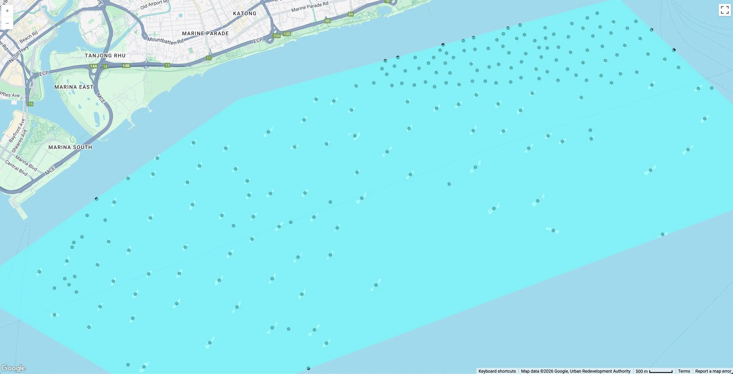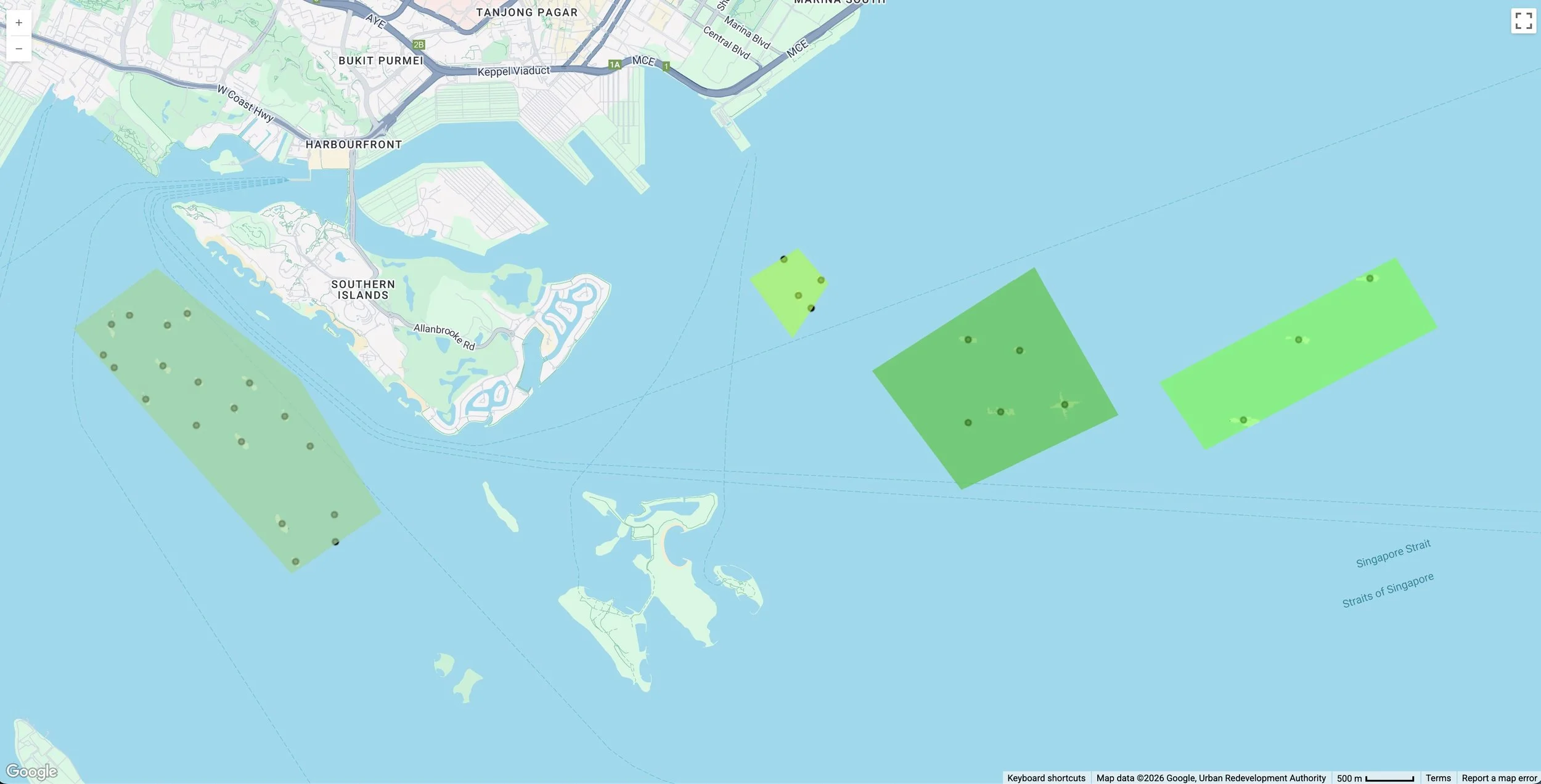 Next, it was time to see how volume of ships in anchorage change over time. But Port of Singapore Anchorage is vast (see below) and time series over the whole area may not yield useful results: For port operation, changes in container ship numbers are not equal to change in small craft volume. Notice there are general anchorage areas, but also designated areas for tankers, explosives, small crafts, specific companies and more.