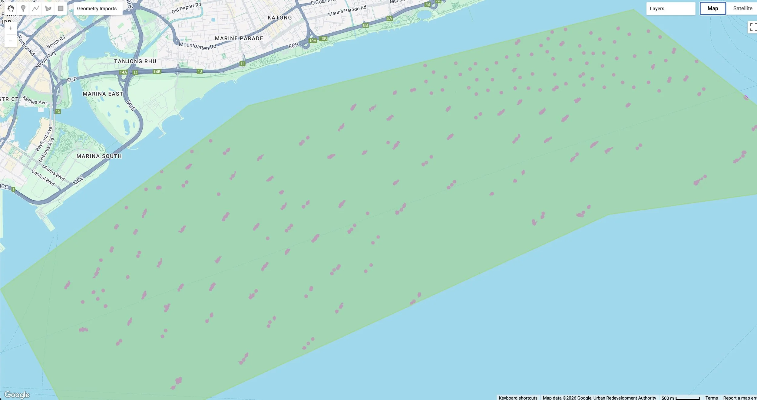 The script now worked both accurately and at volume. I adjusted it to analyse all available imagery. Below is an example where ships are reduced to points. See how both small ships clustered together and large ships are painted correctly just once.