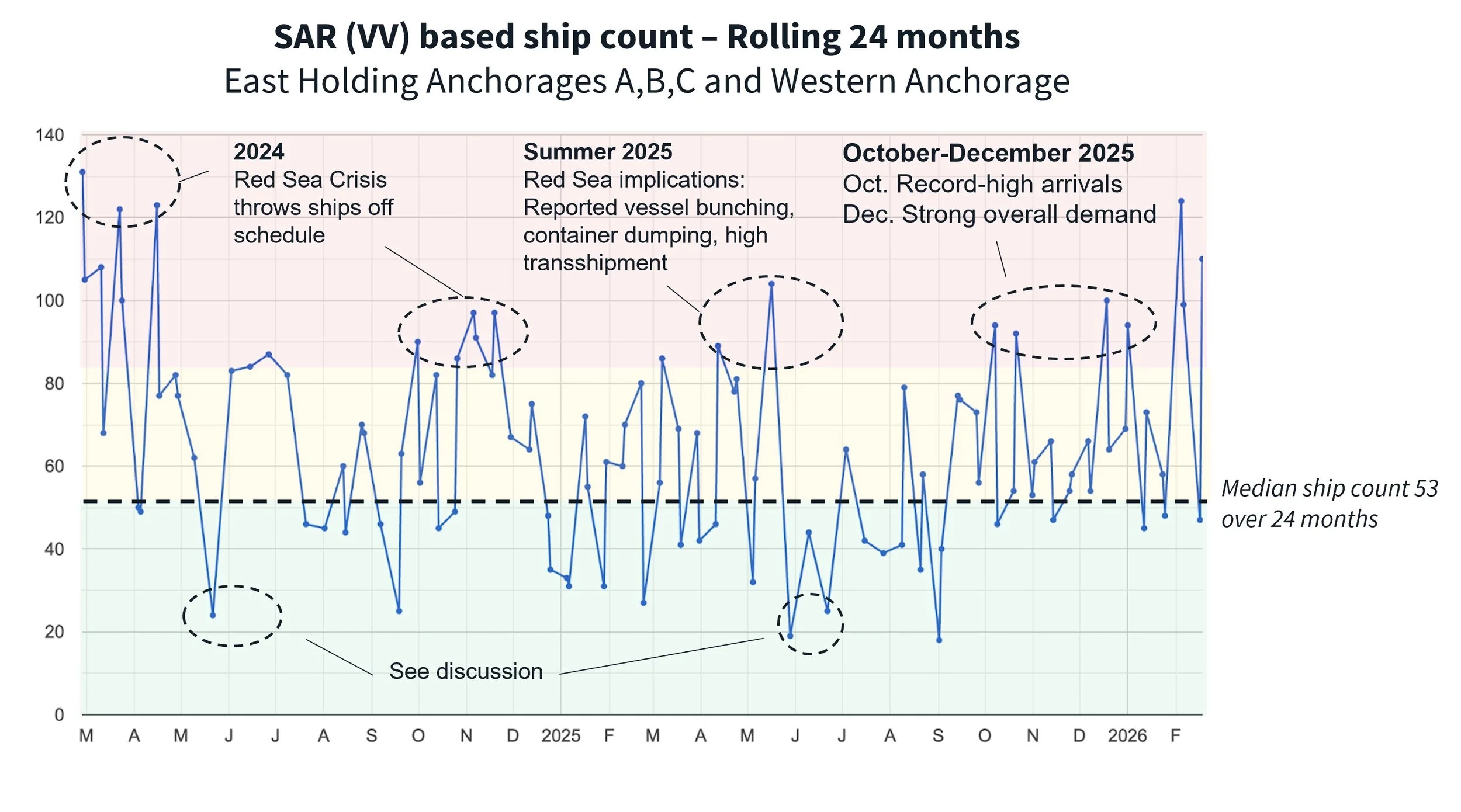 Debugging the image coverage tells me it’s not the result of SAR coverage or the counting, but likely real congestion dynamics. Reported congestion reflects waiting times, not simply vessel count. During peak congestion, ships may drift underway or anchor outside the defined AOI. Vessel count alone does not fully capture operational strain.
