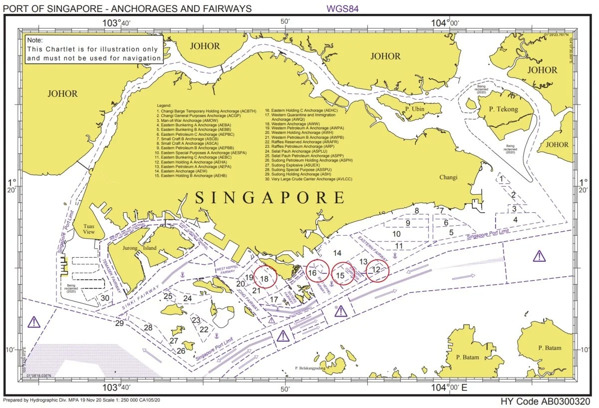 Port of Singapore anchorage map with target study areas circled. Image copyright Maritime & Port Authority of Singapore.