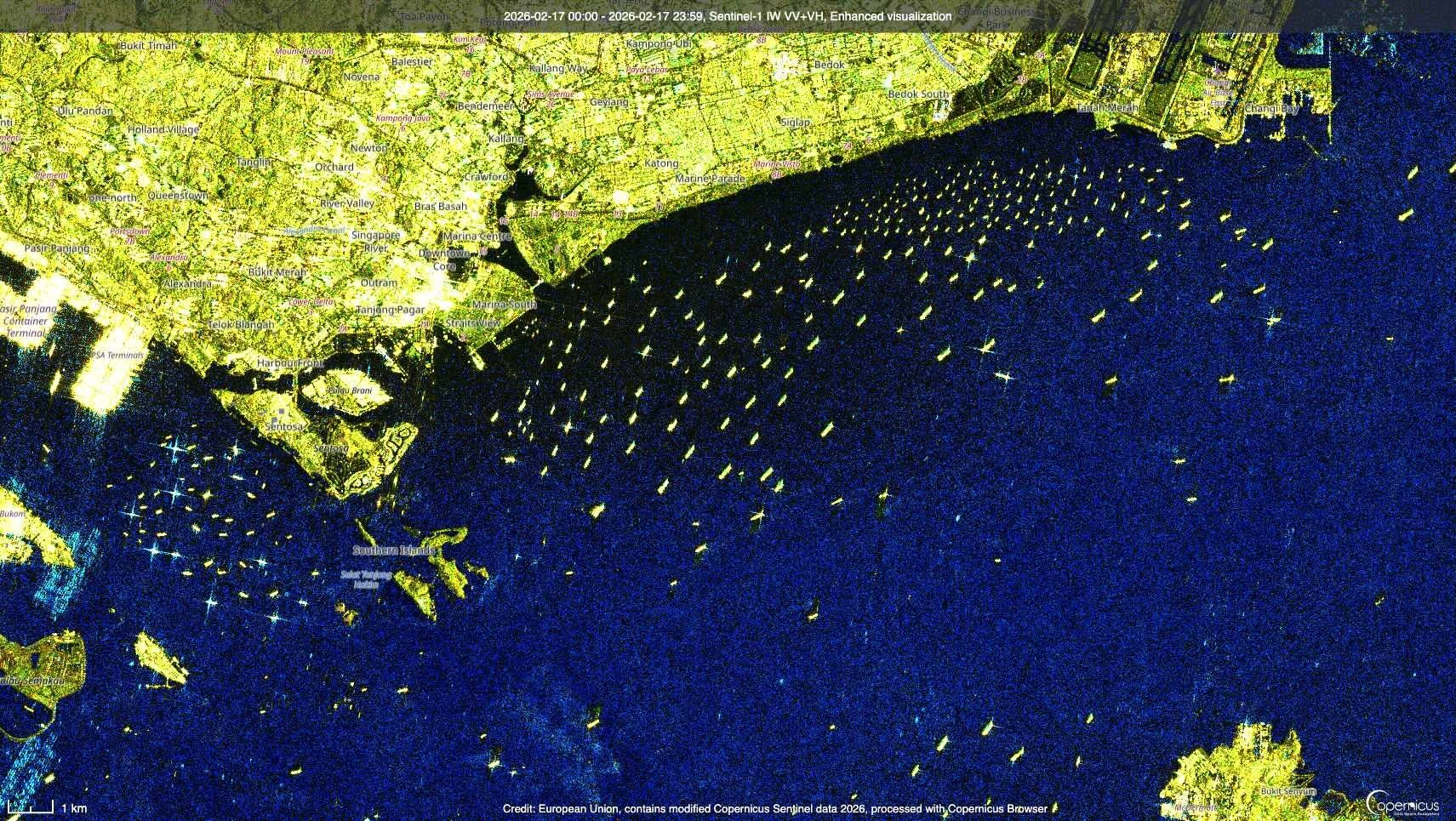 Sentinel-1 SAR Enhanced visual of Singapore anchorages.
