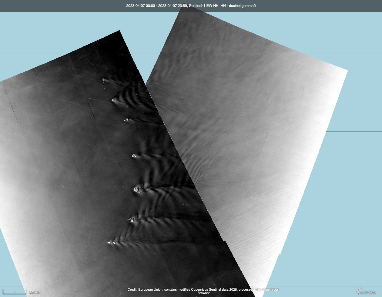 Why are these formations visible in SAR? My first thought was that perhaps the moisture differences or cloud ice crystals cause enough reflection differences to show up in SAR. A 2015 paper by A. Ivanov in the International Journal of Remote Sensing explains the associated wind of wave clouds affect the sea surface, causing alternating areas of smooth and rougher texture. That the effect is visible over hundreds of kilometres tells us two things: The atmospheric waves are powerful, and SAR is remarkably sensitive to subtle changes in surface roughness.