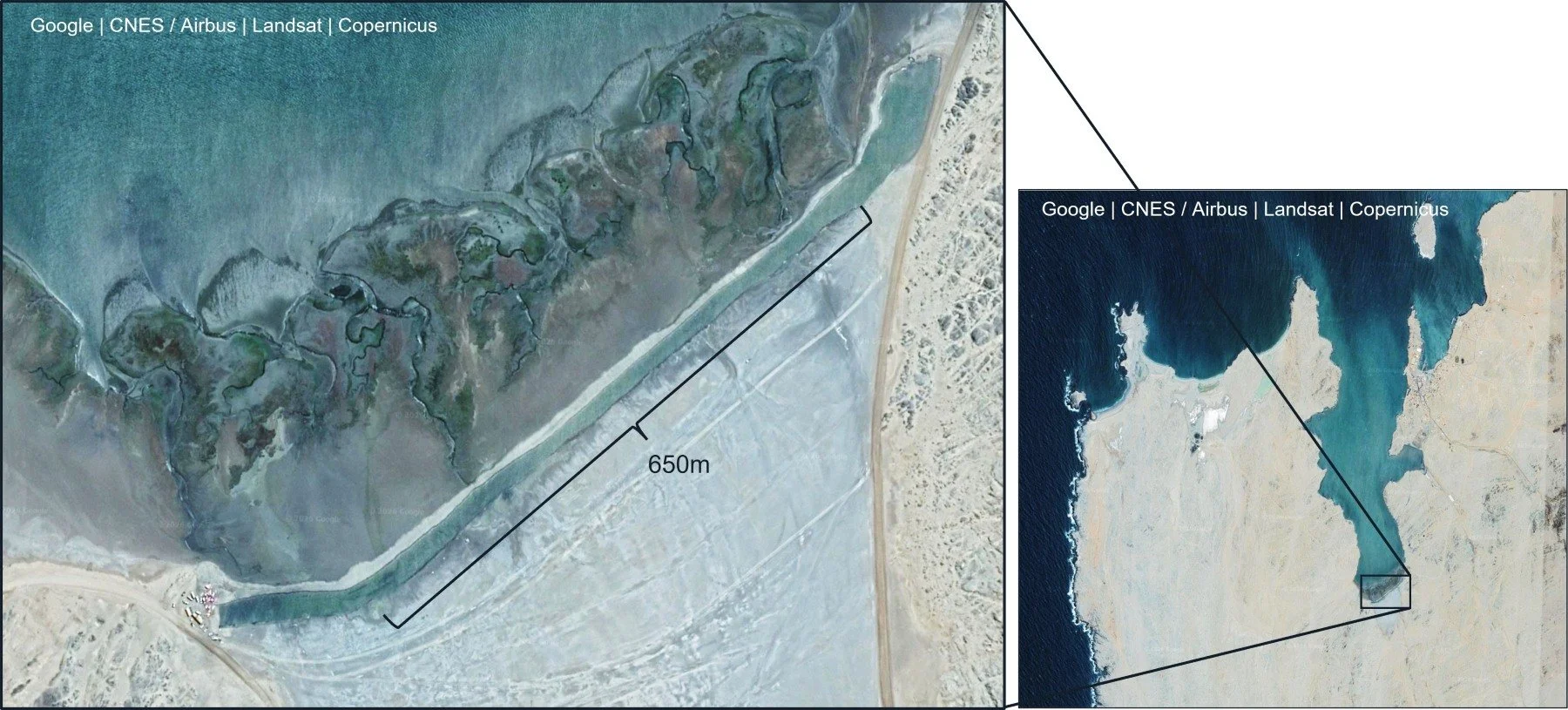On closer look, the coastline here is not smooth but jagged with peninsulas, bays, and shallow lagoons that naturally accelerate wind. The satellite image below shows that the speed challenge area sits exactly at the southern part of bay - a natural wind tunnel.
