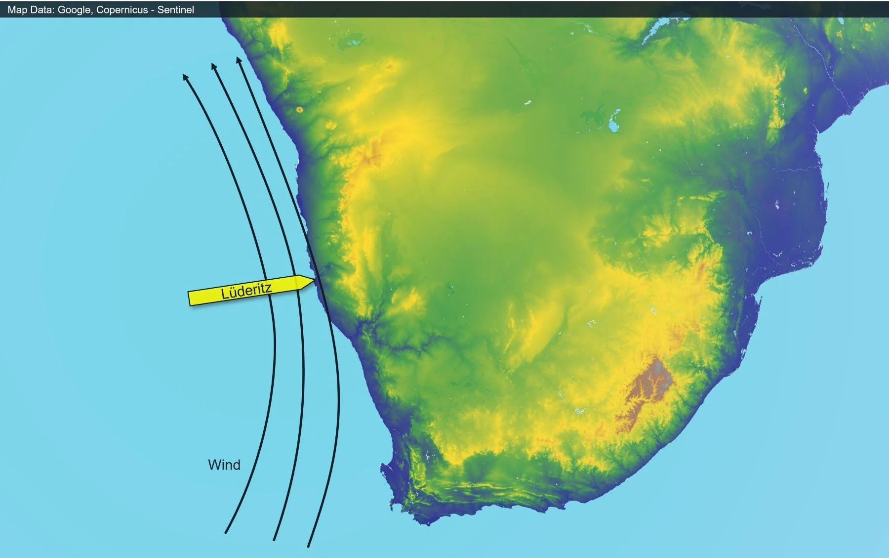 In the big picture, the entire African continent shows as an elevated plateau on the elevation map below. The winds circling counter-clockwise over the Ocean are thus compressed on the coast. You can see that Lüderitz sits at a slight bump on the coast, with potential for even more compression.