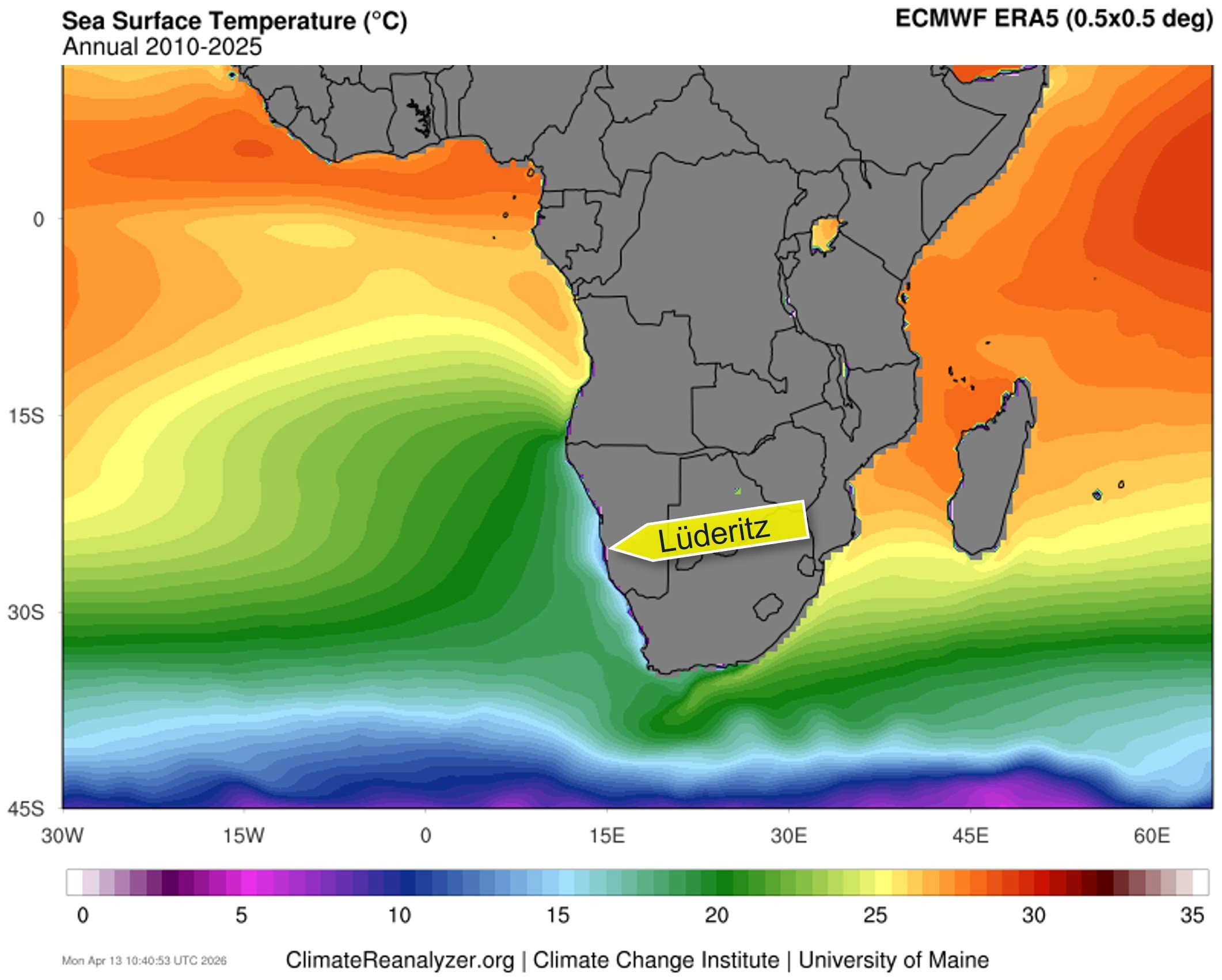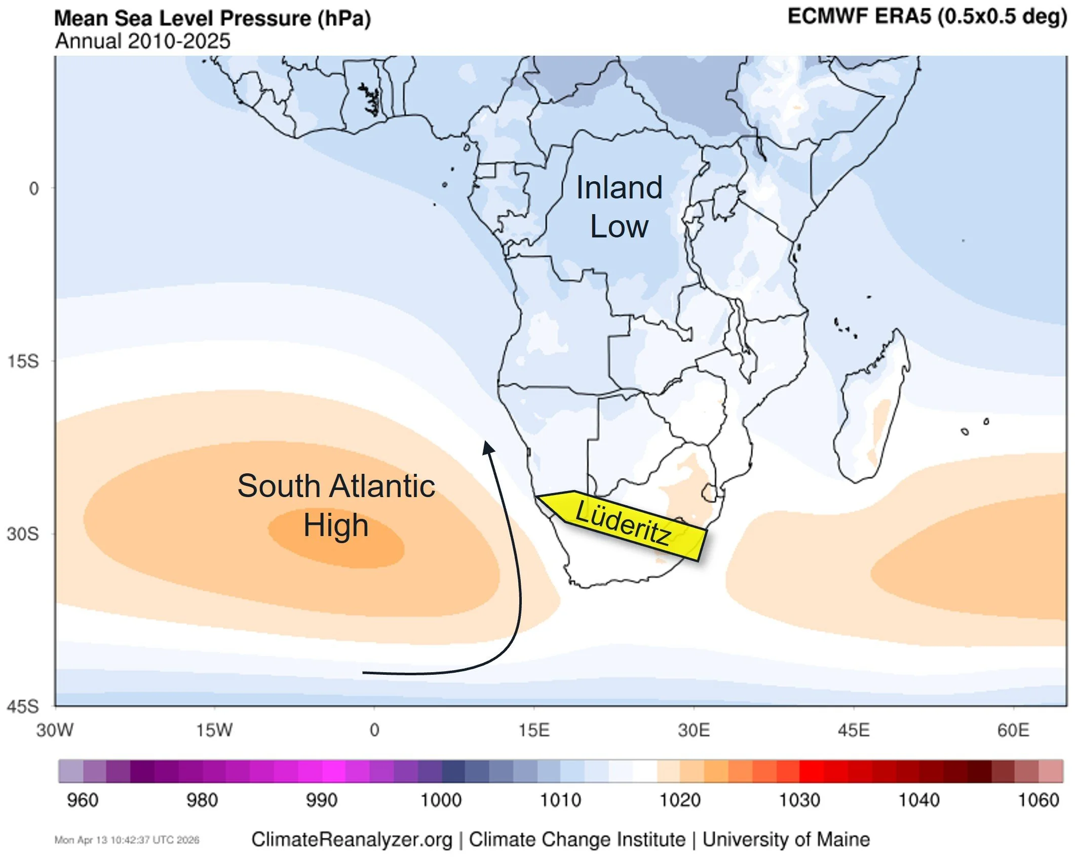At a global level, Lüderitz sits under the influence of the South Atlantic high-pressure system, part of the subtropical belt. This system creates a persistent south-to-north wind flow along the southwest coast of Africa.