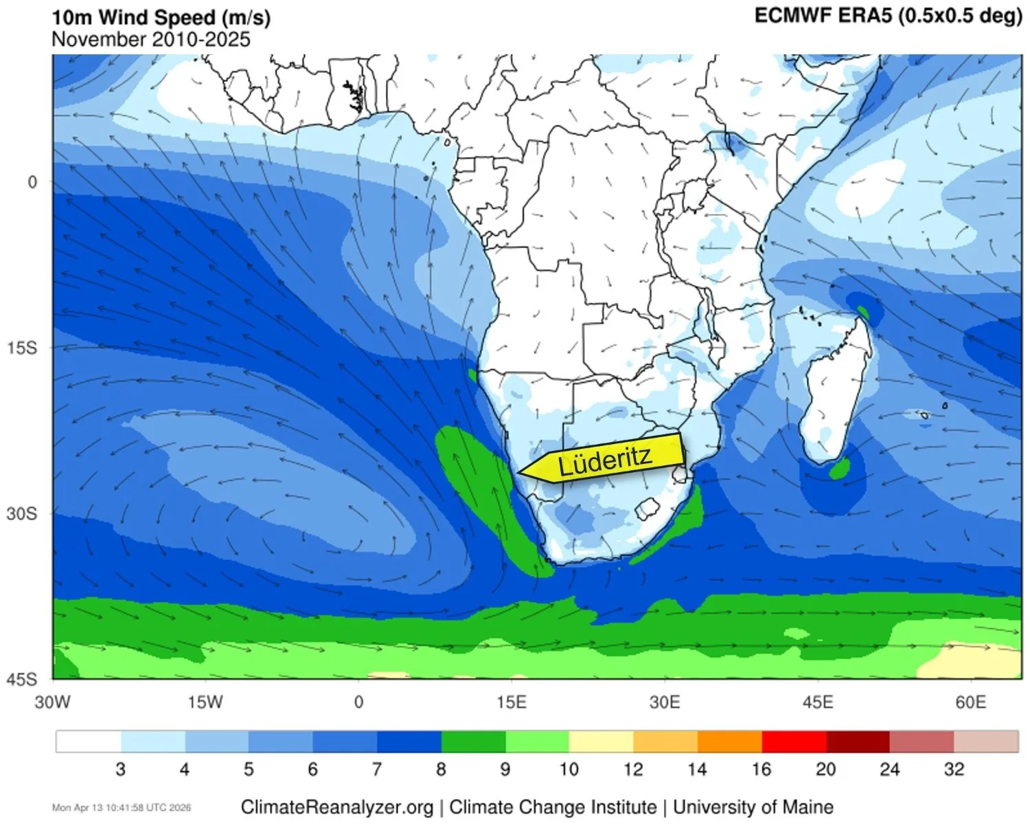 This is Fall in the southern hemisphere. In the November data, we see a stronger high-pressure area on the southern Atlantic, and also a stronger low pressure over Africa due to inland heating in the desert. The tightest curve neatly intersects around Lüderitz. In plain terms, a stronger pressure gradient means more wind - see below wind speed data.