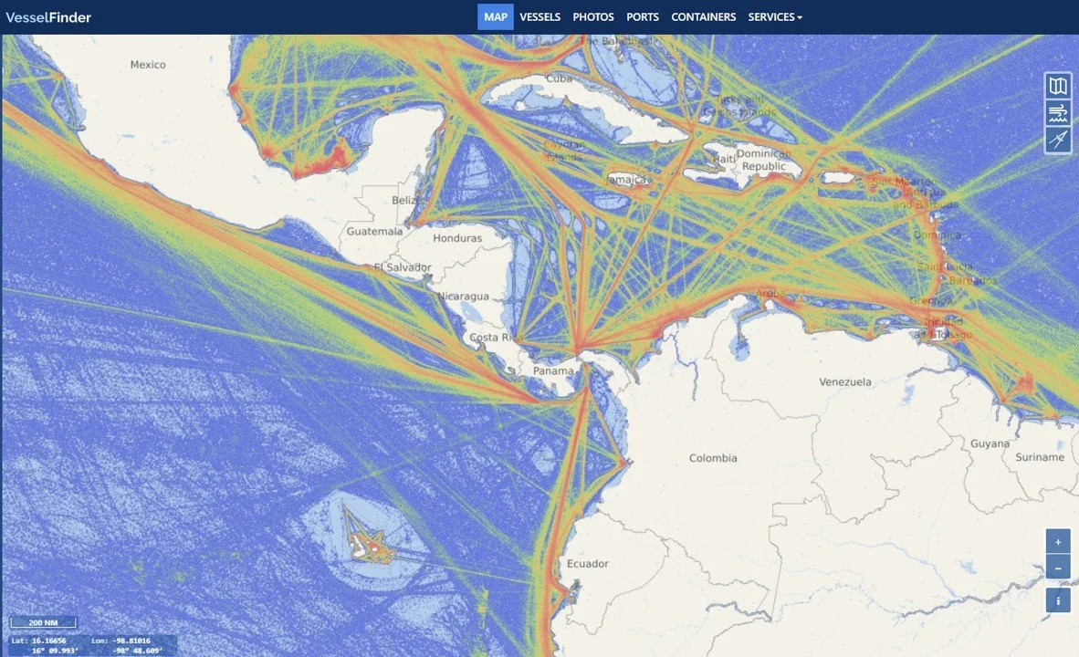 AIS density map showing vessel paths to and from Panama Canal at the image centre. © VesselFinder