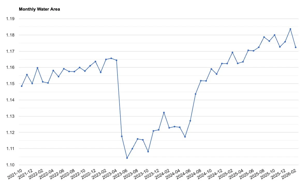 See below data the script produced for 2022-2026 and for comparison the official Lake Gatún water levels below it. It’s not perfect, but as a 30 minute exercise to create a satellite proxy to track water levels, surprisingly good. The data comparison shows it most importantly captures the droughts, but struggles to separate changes near the high-water mark. For canal operations, this is less important. The next step would be to convert the lake area into an elevation estimate.
