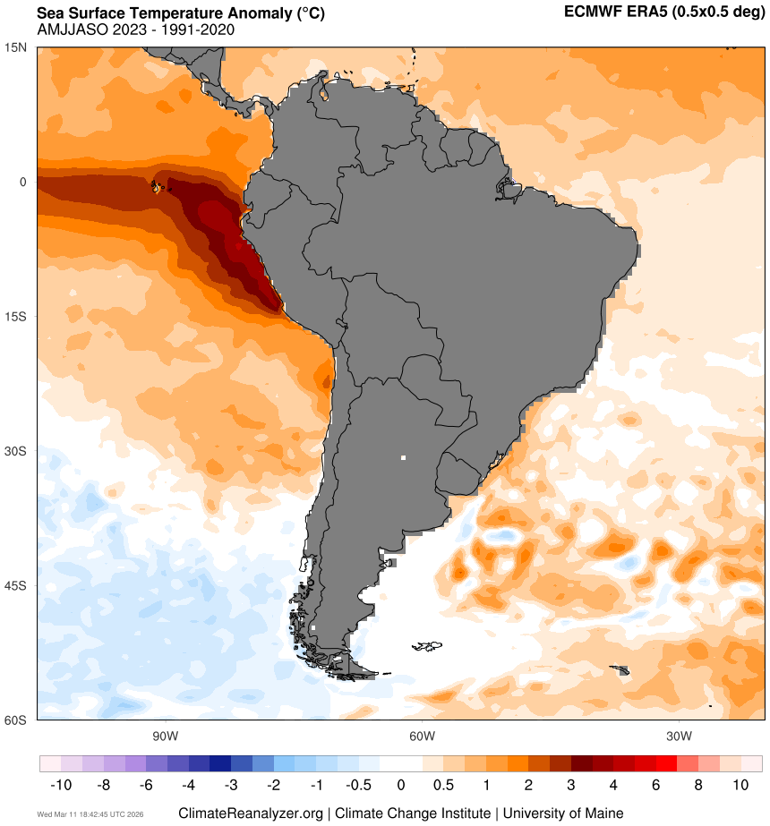 Sea surface temperature anomaly data shows El Niño off the coast of Peru and Ecuador.