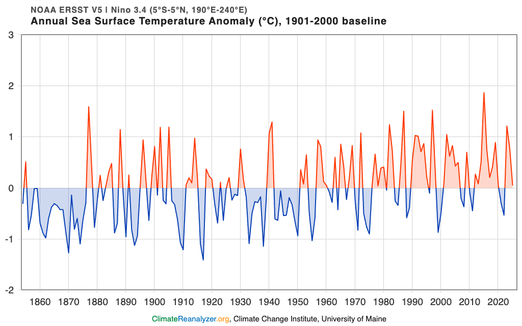 It’s one thing to hear that at school 20 years ago, another to see what the data says today. Below is the 100-year record of sea surface temperature anomalies in the key El Niño region. Red peaks correlate with El Niño, blue with La Niña.