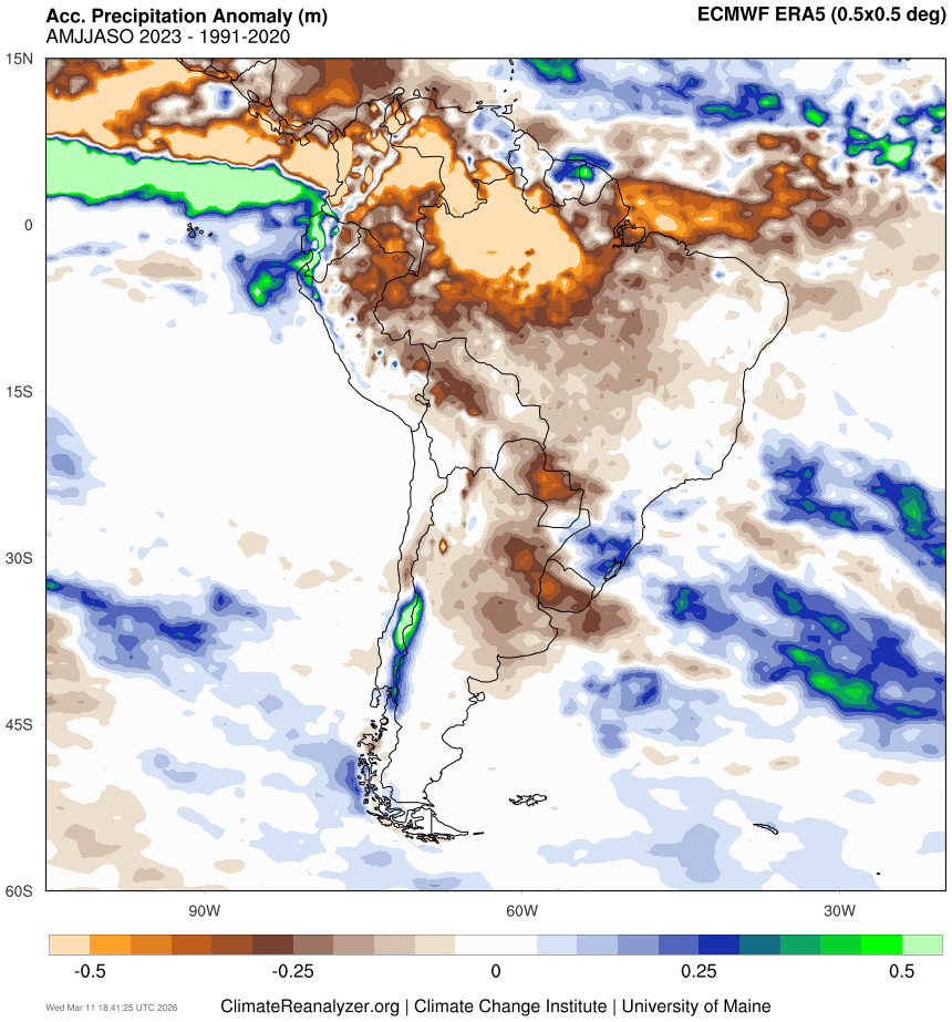 Below is the precipitation anomaly for roughly the wet season in 2023, when the drought started. As we can see, there is clear brown area over Panama indicating rainfall patterns were notably lower compared to long-term average.