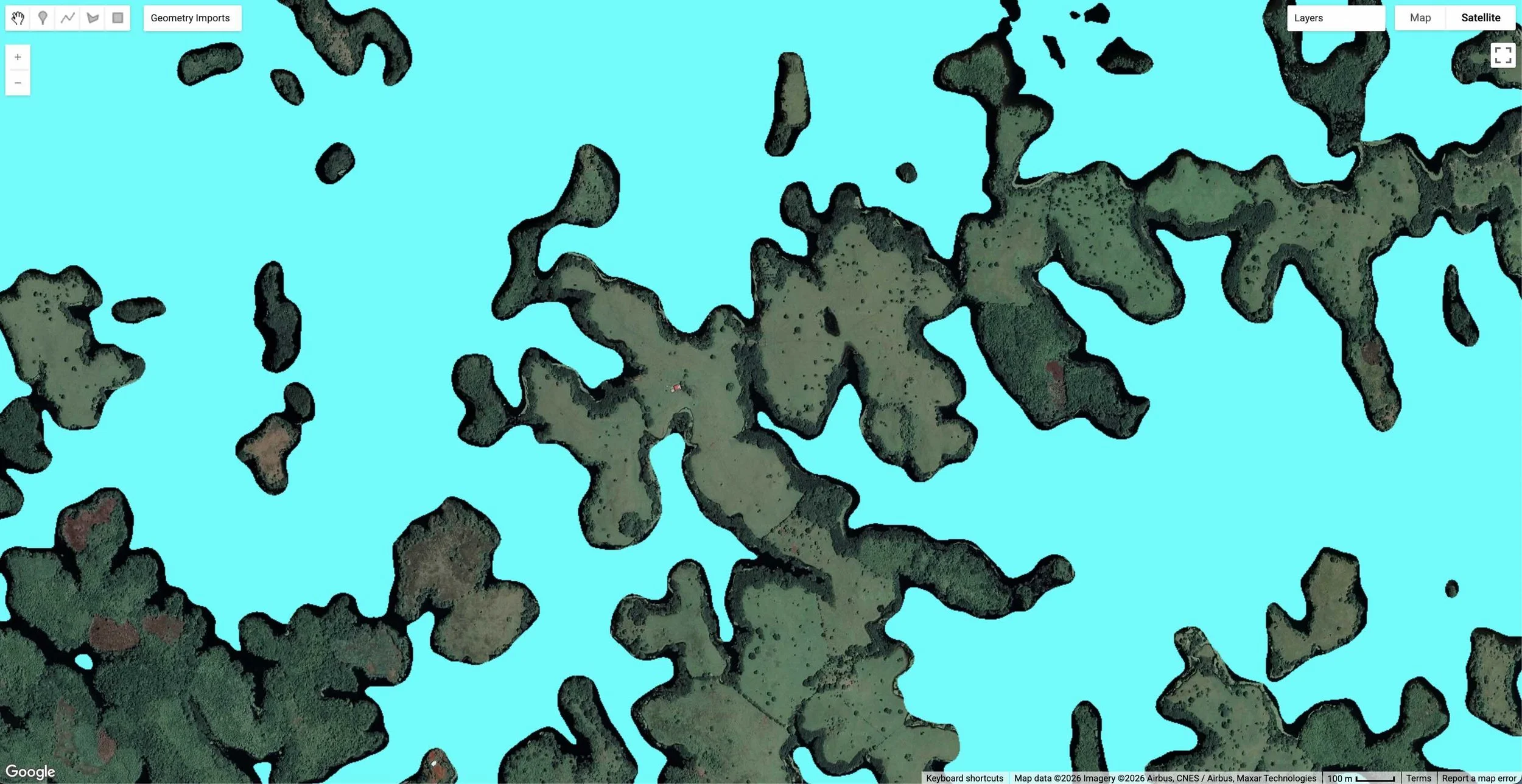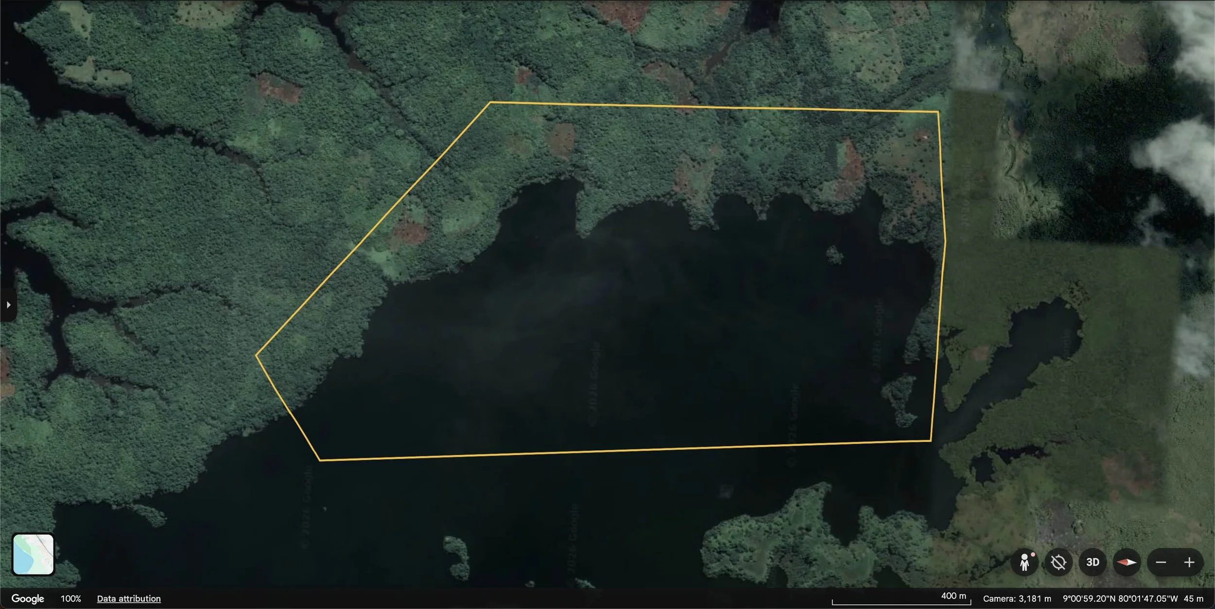 Instead of capturing the entire lake, I tried a small cove that reacts extremely strongly to water level changes, but the small-ish area brought in other sensitivities that made it a poor proxy. I next tried to capture a larger area with many coves (like the one below), which was quite close to reality but the large coastline compared to surface area meant it became too sensitive to vegetation changes at the waterline.