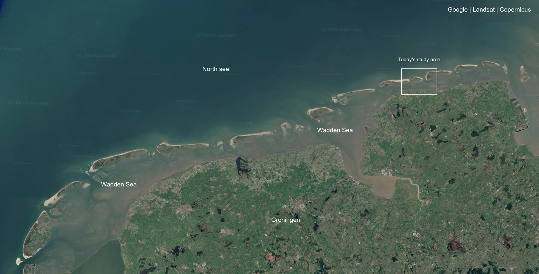 The Frisian barrier islands in 2020. Today’s study area market with the white rectangle.