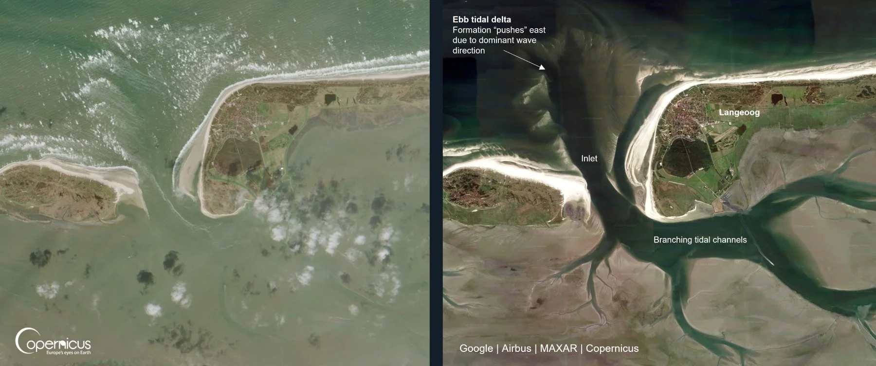 Without waves, this would look like a flat, slightly murky sea. With waves, the seabed reveals itself in detail. By combining spot and mosaic satellite images, we were able to see both layers and arrive to an explanation as long as we understood basic tidal dynamics.