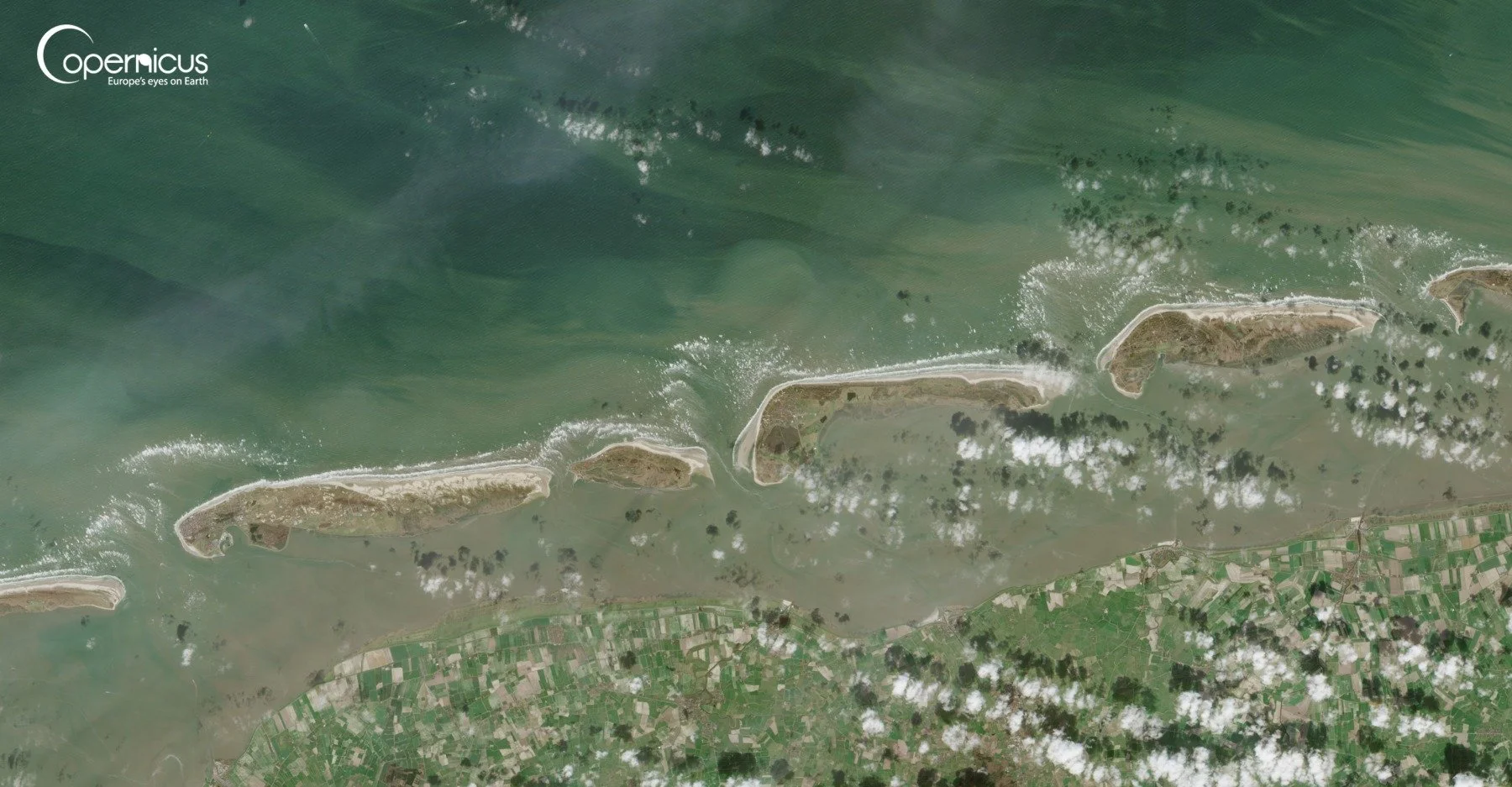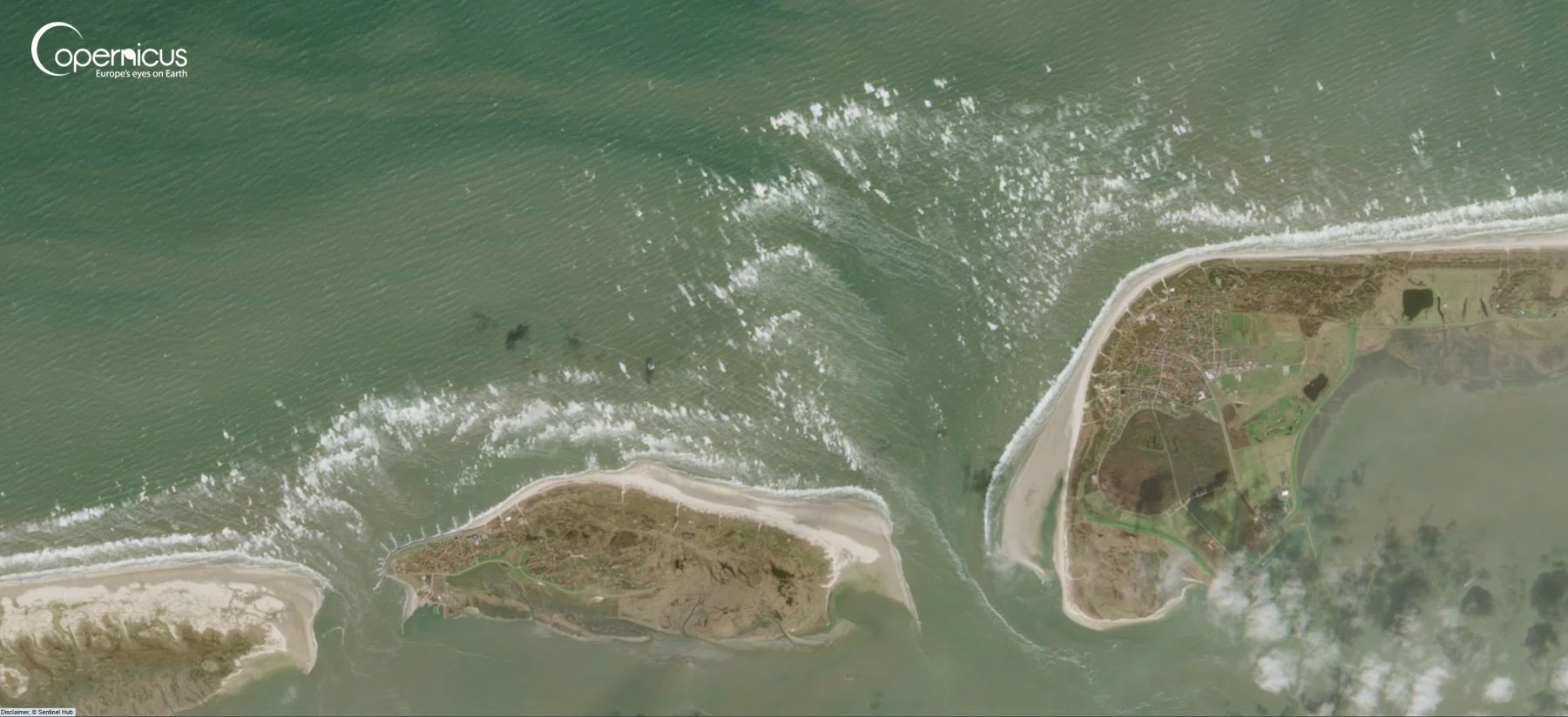 In the satellite image then, water is actively draining out of the Wadden Sea so currents through the inlets are strong and focused. Also, water levels are dropping, bringing seabed features closer to the surface - but high enough to be fully submerged.