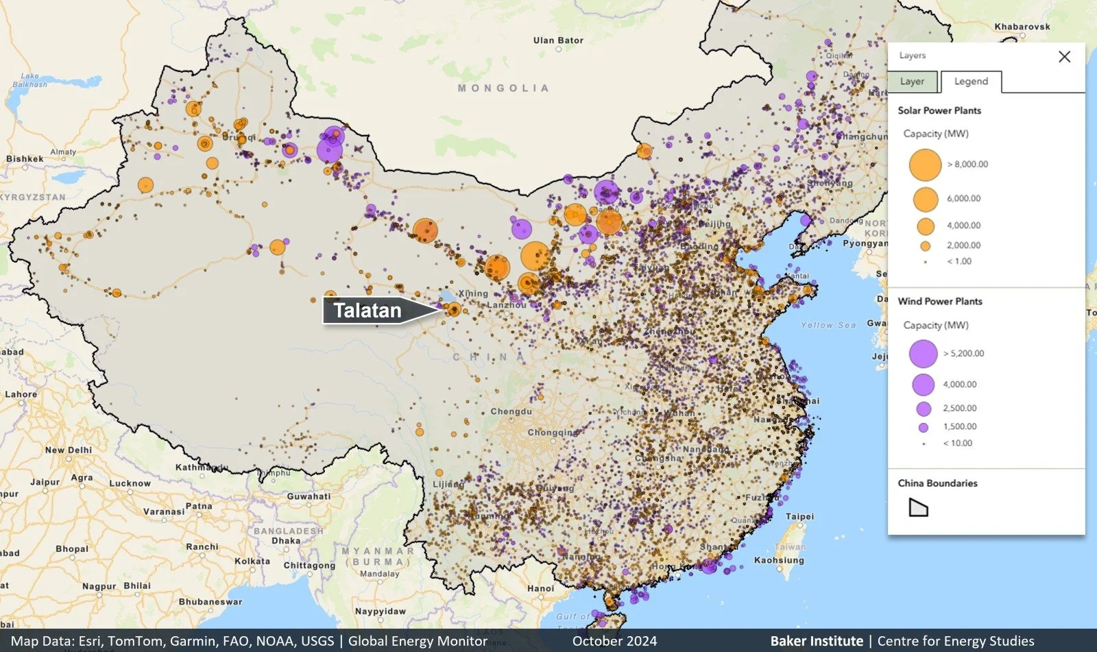 The Baker Institute has published a superb China infrastructure map, which outlines several large-scale developments falling neatly into the earlier marked “why not here” area. See below the map in action, with solar and wind projects in orange and purple, respectively. The data is from October 2024, when the Talatan bubble was still small.