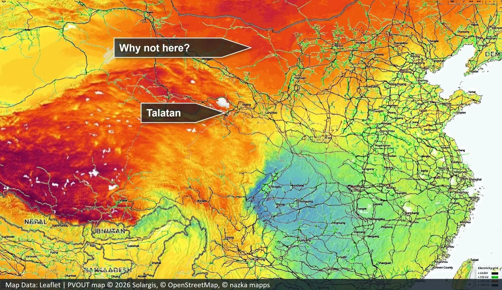 I once advised a large industrial manufacturer in Europe regarding their location strategy. By far the most constraining requirement was high-power grid connection. By overlaying China’s electricity grid on the previous solar irradiation map, we get the below view.