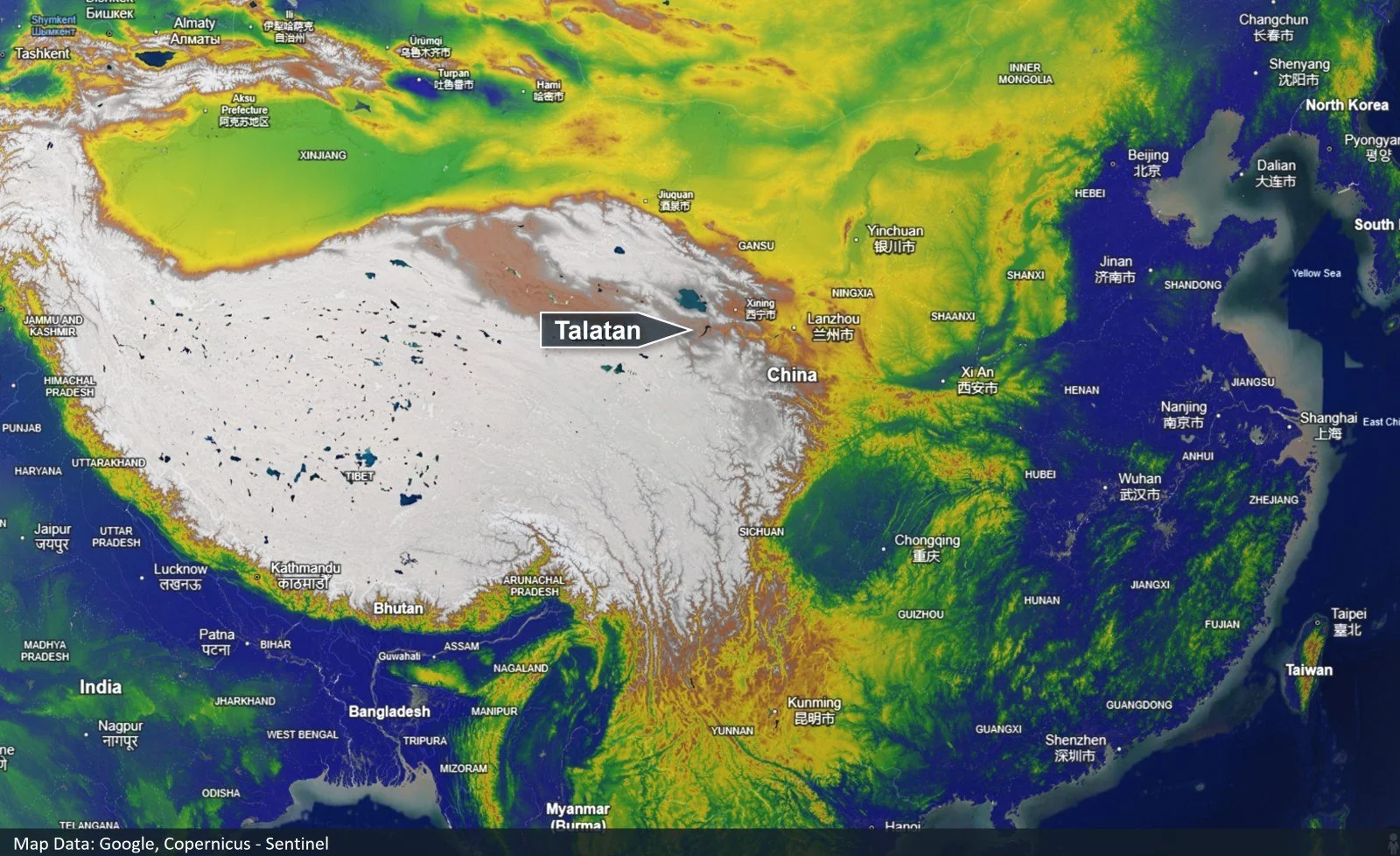 Talatan is the size of Paris, so you need a Paris-sized piece of flat, unbuilt land. In China, that is not a problem. Below is the elevation profile of China showing Talatan’s location on the northeast corner of the Tibetan plateau.