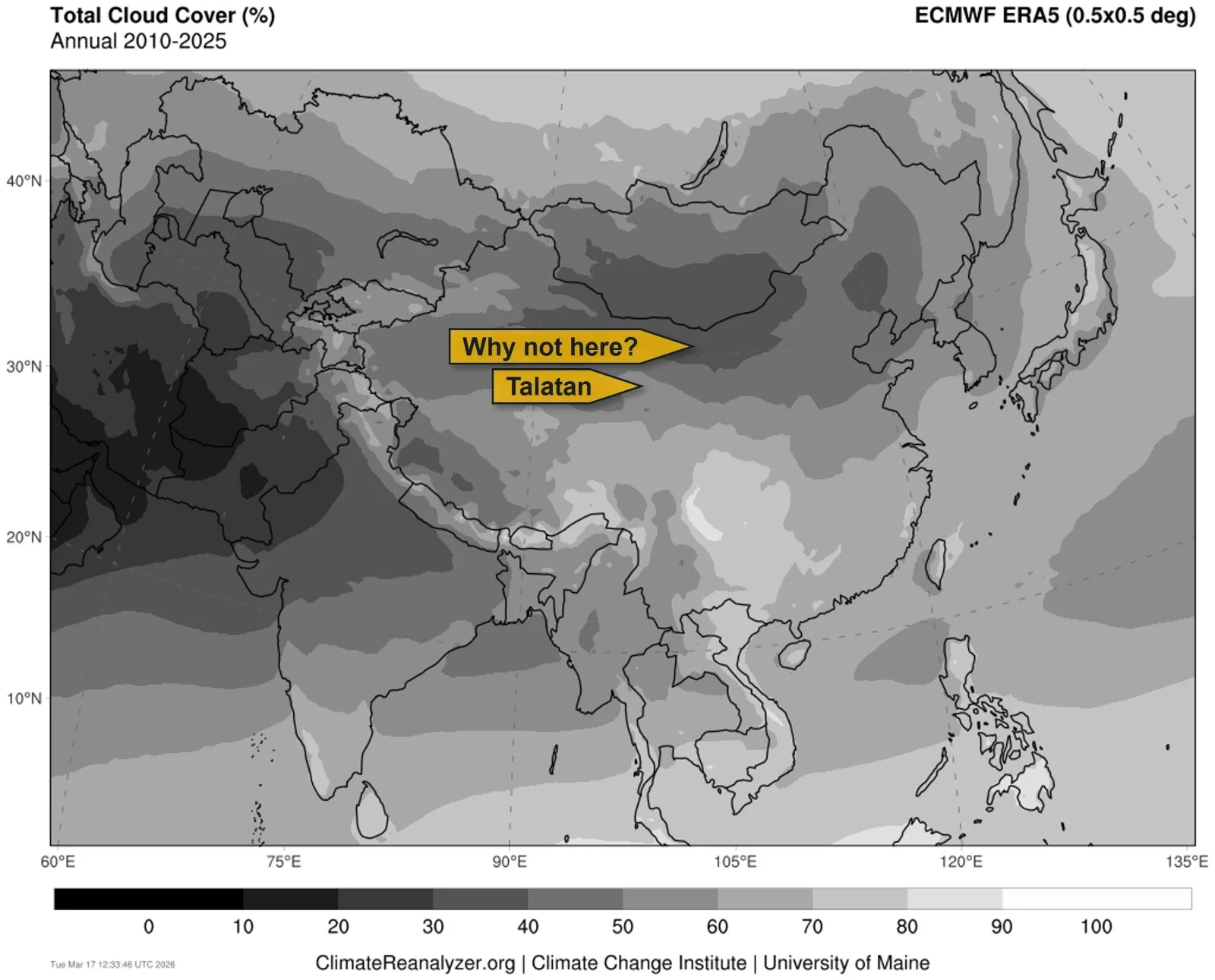 Cloud cover role needs no explanation, but below is the map of average annual cloud cover over China. Darker areas mean prevailing clear skies. As we can see, Talatan is under skies that have ~40% cloud cover, but there would be even clearer skies up north towards Mongolia. This is the first time I thought why not build there.