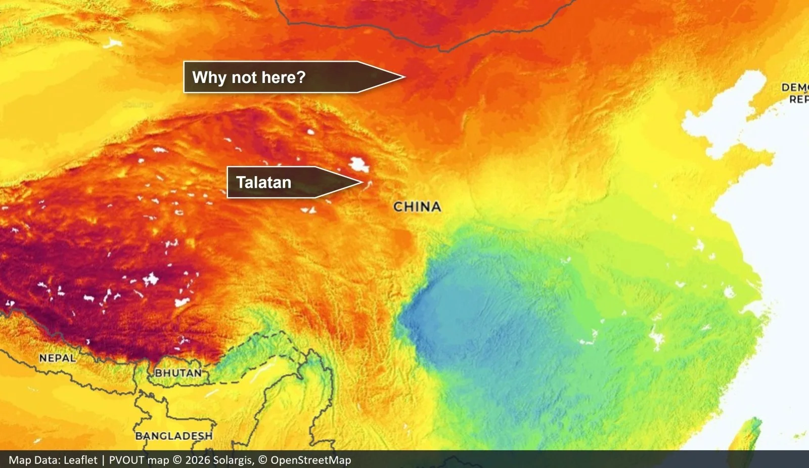 This reinforces the question: Why was Talatan not built to Gobi desert closer to Mongolia, where the irradiation is actually a little bit higher and the terrain is flatter? Because solar potential alone does not explain Talatan’s location
