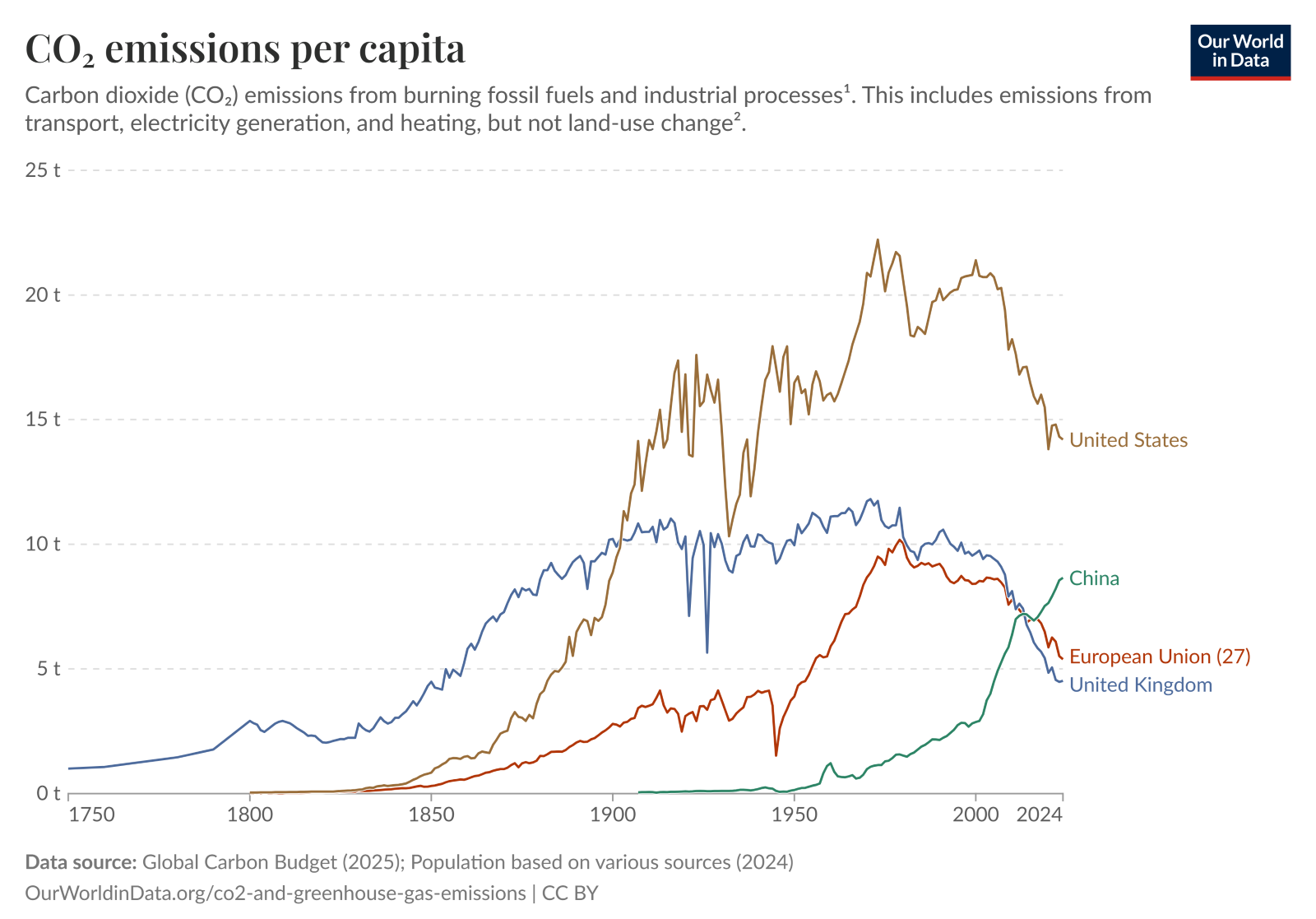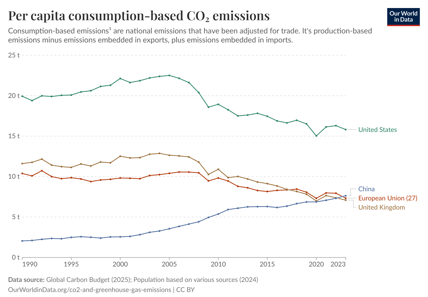 When emissions are adjusted for consumption (import/export effects), the gap narrows significantly, bringing China closer to EU/UK levels on a per capita basis, though the latter are headed down and rightly deserve their statuses as sustainability world leaders.