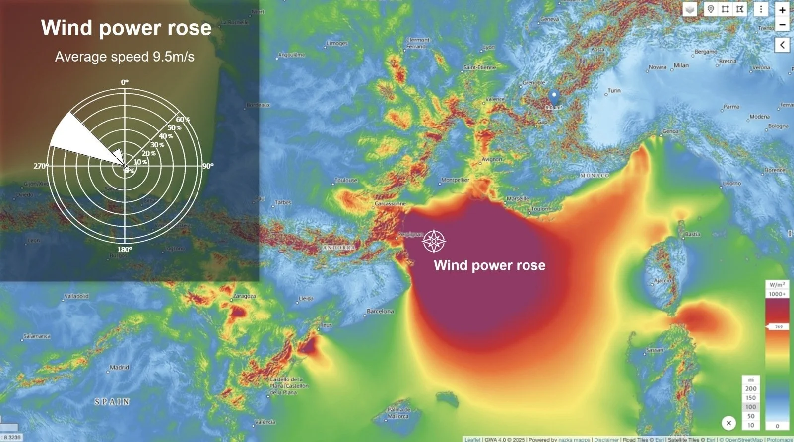Wind energy accumulation map showing the Tramonte area in Purple.