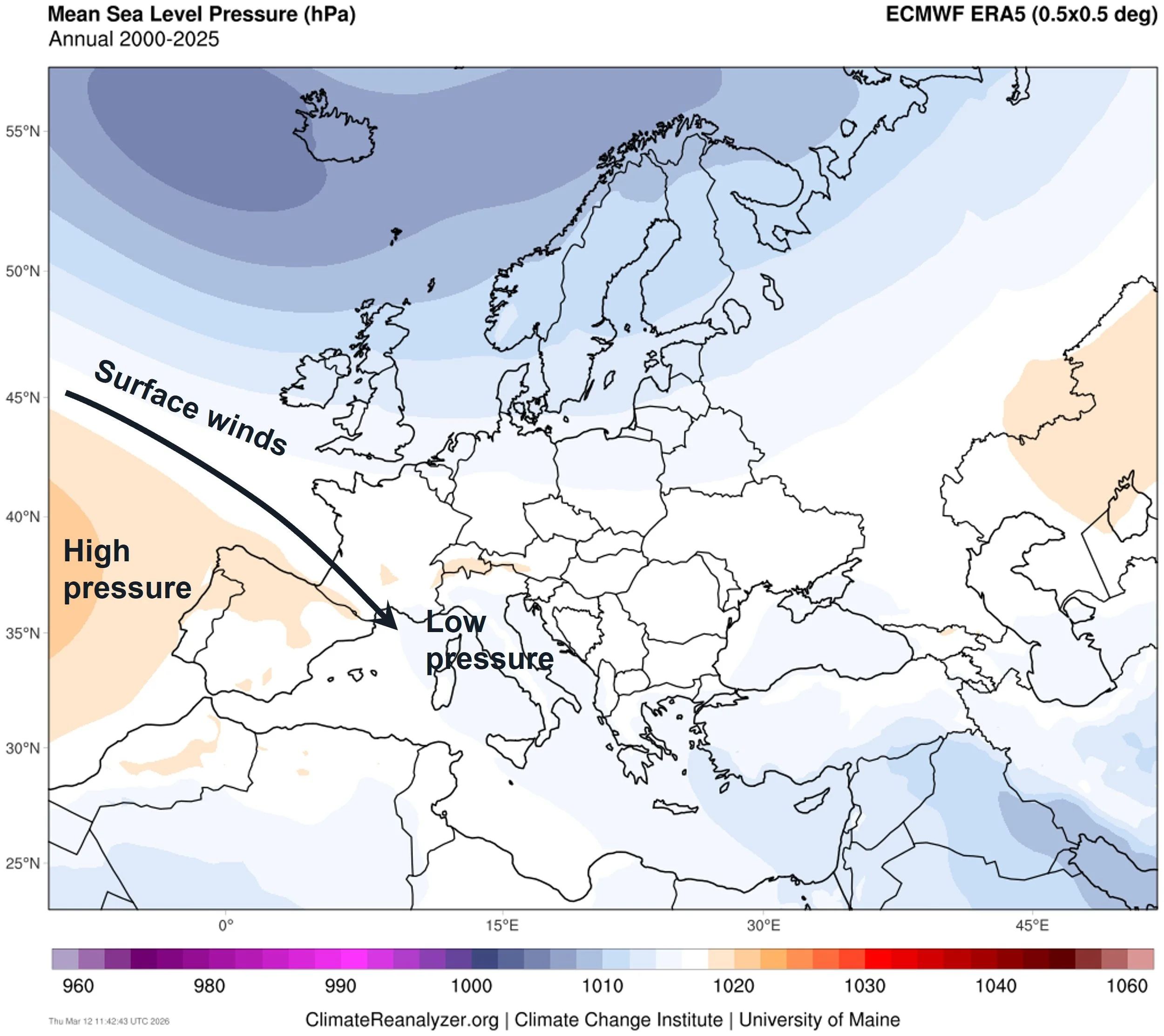 These two pressure systems are prevalent, as seen in the 25 year data period below. It shows which areas are dominantly high pressure (shades of orange) and low pressure (shades of blue) during a typical year.