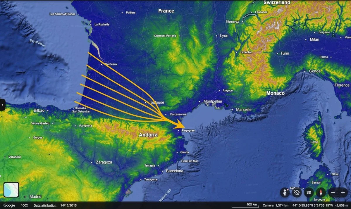 Wind flows like water around obstacles. In Tramonte, the Pyrenees block the flow in the south, and the Massif Central in the North. They naturally funnel the wind, which heavily increases windspeed (called Venturi effect). This is marked on the map below.
